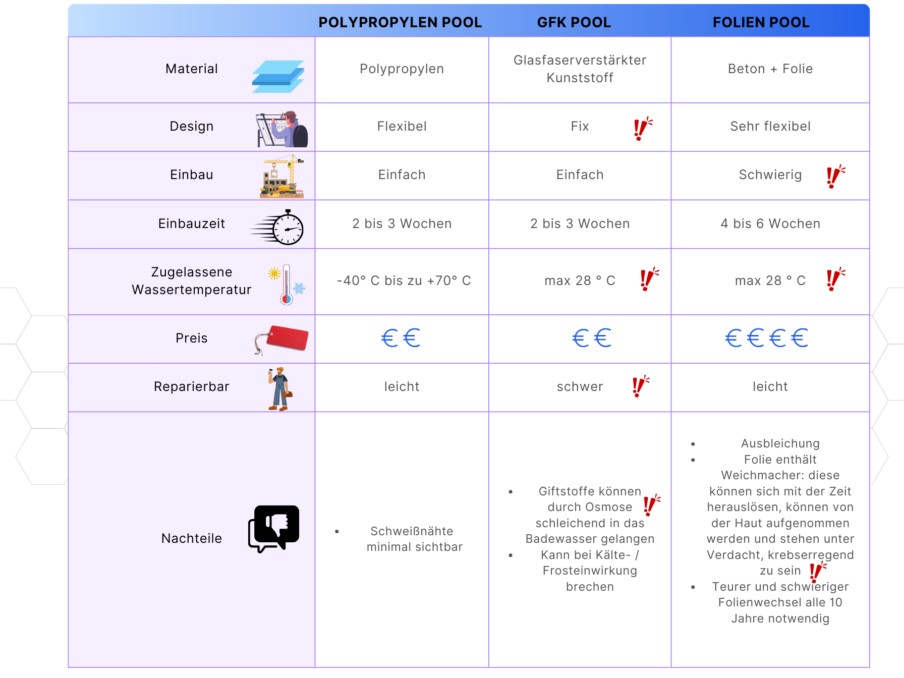 Hier ist eine kurze Tabelle mit Schwimmbecken aus Polypropylen, Gfk (Glasfaserverstärktem Kunststoff) und Folienpool.